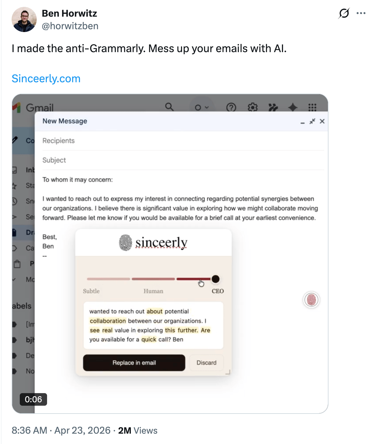 The anti-Grammarly went viral. Sinceerly, spelled with a second “e”, is a Chrome extension that takes AI-generated emails and adds typos, kills em-dashes, and breaks the "not just X but Y" construction so your messages stop reading like AI. It was built in a month by Ben Horwitz, an HBS student and Dorm Room Fund partner. The tool has three modes (Subtle, Human, CEO) and Horwitz claims he tested it by cold-emailing five Fortune 500 CEOs. Four replied. Two of the replies had typos. Maybe they were also using Sinceerly. For more, check out his recent TBPN appearance.