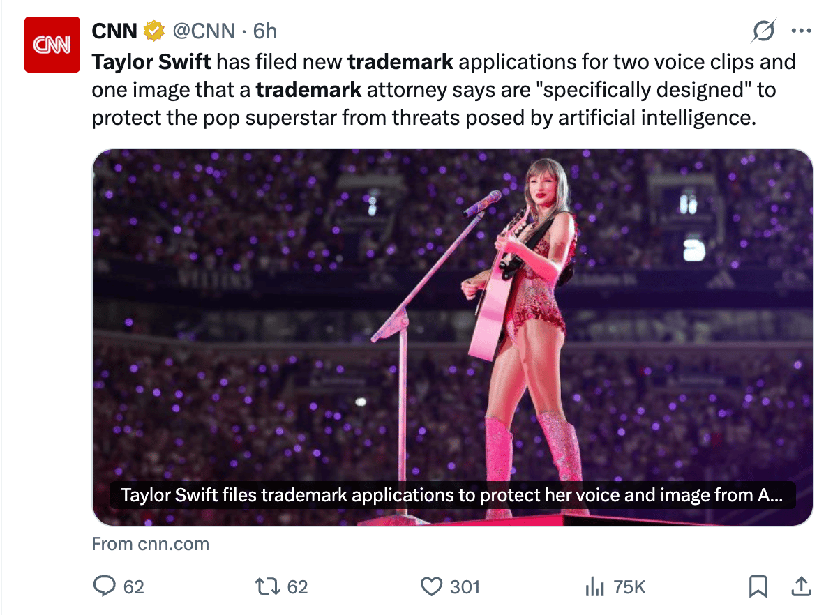 Taylor Swift trademarked her voice. TAS Rights Management filed three trademark applications on Friday. Two are sound marks ("Hey, it's Taylor Swift" and "Hey, it's Taylor"). The third is the pink-guitar-and-bodysuit Eras Tour image. The strategy follows Matthew McConaughey, who filed similar trademarks in January as the first A-lister to use trademark law as an AI defense. Copyright protects existing recordings. It doesn't protect against AI generating new content that mimics a voice. Trademarks might. The legal theory hasn't been tested in court yet, but expect more of this.