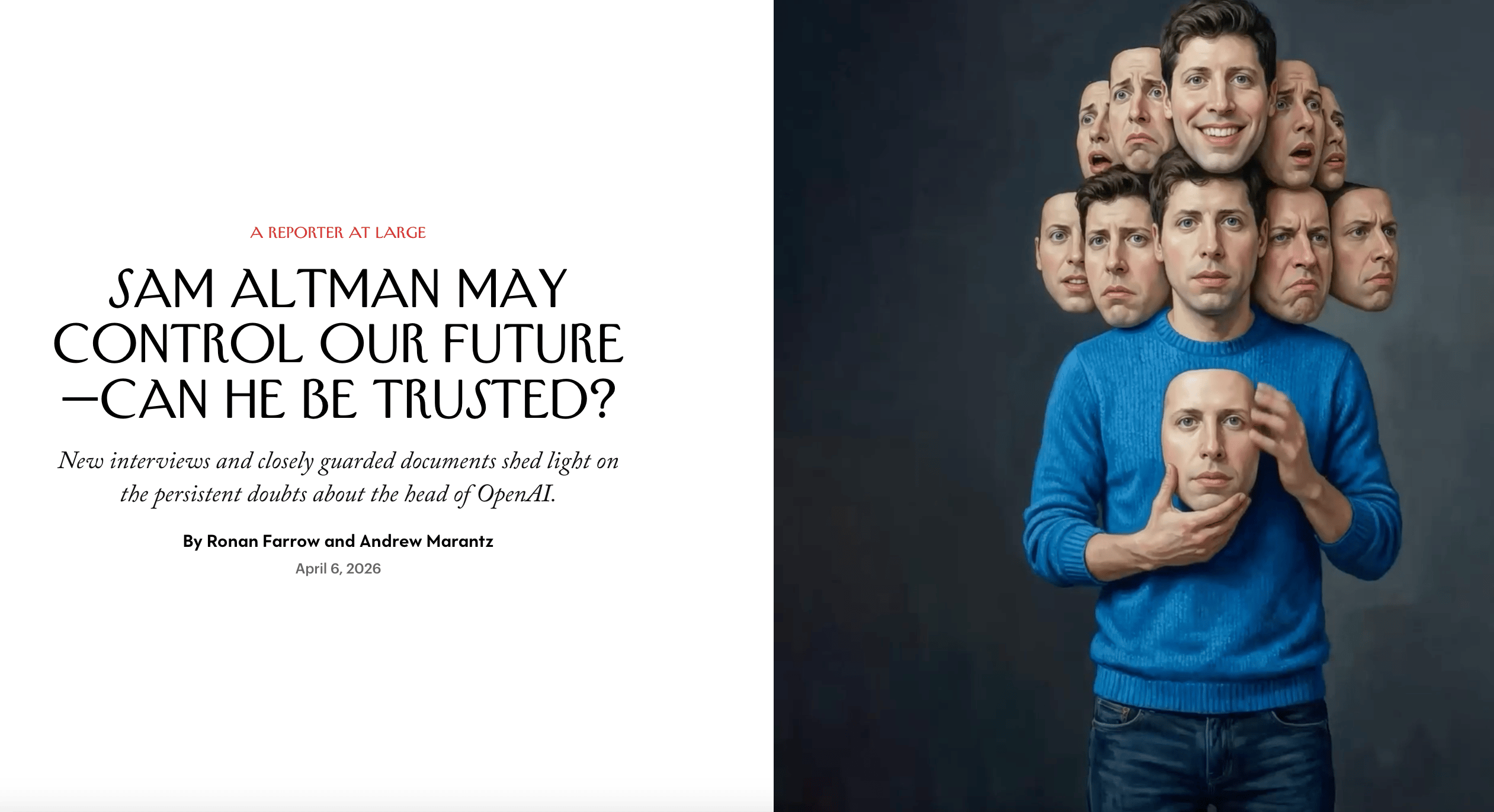 The piece, by Ronan Farrow and Andrew Marantz, draws on over 100 interviews and internal memos from people inside OpenAI, including Ilya Sutskever and Dario Amodei. The portrait is of a CEO whose own colleagues questioned whether he could be trusted not just with the company, but with the technology. If you've been following the OpenAI story, very little of it will surprise you. If you haven't, read it.