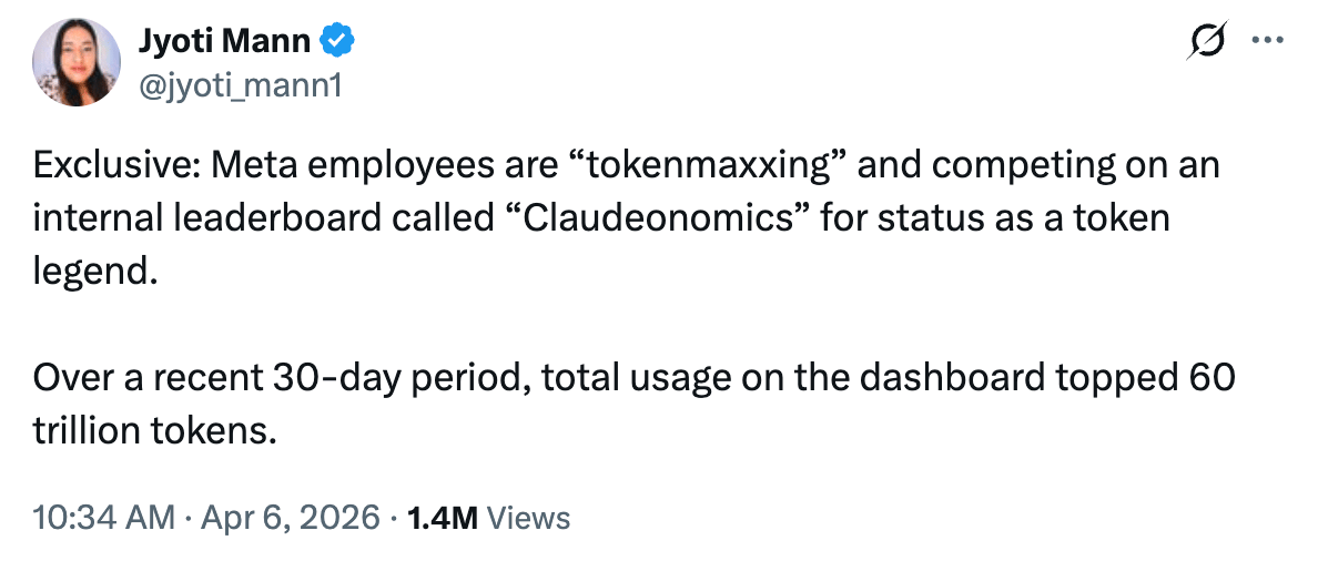 Meta's token leaderboard. Meta employees are competing on an internal dashboard called Claudeonomics to see who can consume the most AI tokens. Top titles include "Token Legend" and "Session Immortal." Over a recent 30-day period, the top 250 users consumed over 60 trillion tokens combined. The top individual hit 281 billion in a month. Measuring token consumption and calling it productivity is the same mistake as measuring lines of code written. Input isn't output.