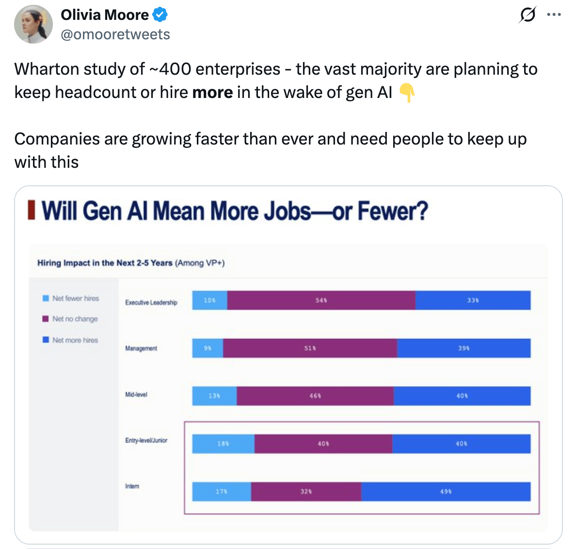 More jobs, not fewer. A Wharton study of roughly 400 enterprises found the vast majority plan to maintain or grow headcount in the wake of generative AI. Entry-level and intern roles face the most pressure. Senior roles are net positive. MIT's CSAIL published research this week reinforcing the point: AI is advancing through the labor market more like a rising tide than a crashing wave — broad and gradual, not concentrated disruption in specific roles. If you're reading this newsletter, the data is probably in your favor. But only if you're building the skills.